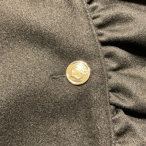 Turn heads and gain compliments when you step out in this size mediumdress coat with a large, eye-catching ruffle collar and functional front pockets. Toss it on over jeans or even your favorite comfy pants for an effortless, stylish look as you head out the door, even on chilly days. Beautiful gold buttons and length is 41”. 100% polyester & machine wash