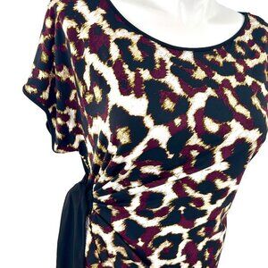 Beautiful new w/ tags dress from Calvin Klein! Black, white, purple and metallic gold animal print, ruched side and tie at waist. Size XL, 95% polyester, 5% spandex. Short Dolman sleeves. Measures 39" long.