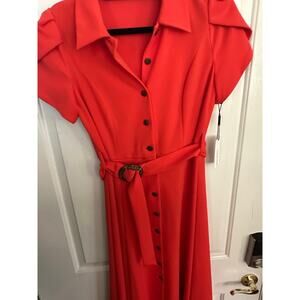 NWT CALVIN KLEIN Women's Red Orange Belted Button Down Midi Shirt Dress Size 6