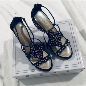 NEVER WORN! Caparros black / rhinestone embellished evening sandal. Zip closure in back of shoe. 4” heel. Gorgeous size 8 brand new shoes! Retail $89.00!