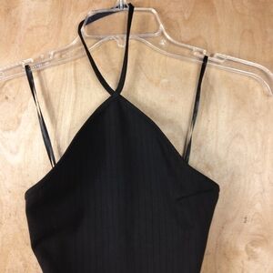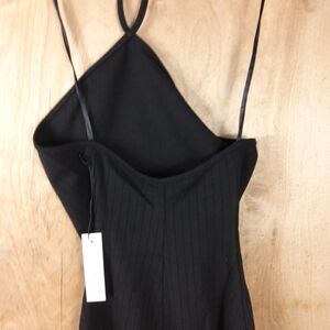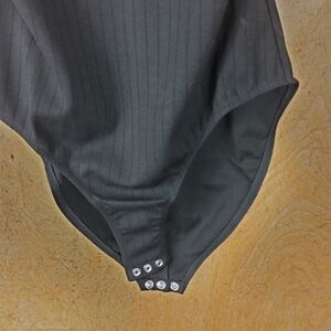 Black polyester rayon blend. Not stretchy. More form fitting. Snap bottom.