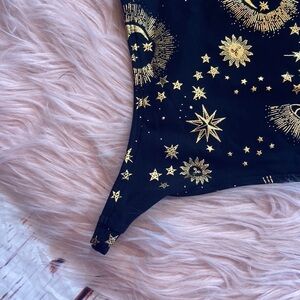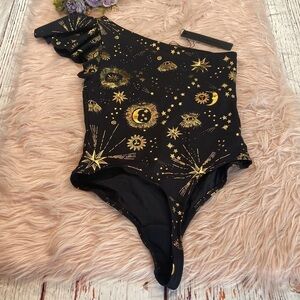 New with tags Carbon38 gold celestial sun moon one shoulder ruffle bodysuit