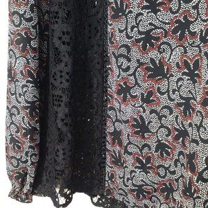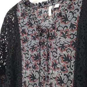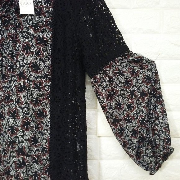 Top Blouse New with Tags CATO Est. 1946 Boho tunic top Sz-L wide Sleeves ruffle trim loose-fit waist. Item in shades of Black Lace leaf floral print with wide long gathered sleeves. In NWT condition with no visible flaws.