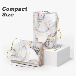 This mini wallet measures 4.25 x 3.35 x 0.7 inch, only 1.8 oz weight, slim, lightweight and does not take space. It is easy to carry by slipping into your front pocket or travel bag. Comes with an extra keyring, works great on a lanyard or bracelet keychain.