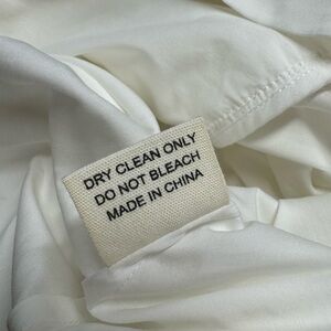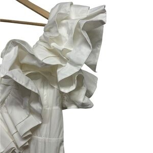 Features: Crisp cotton-blend, asymmetric-style, one-shoulder with exaggerated ruffle detailing, tiered design with ruffled trim, invisible side-zip closure