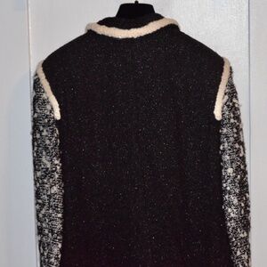 CHANEL METALLIC TWEED KNIT JACKET. NEW WITH TAG. NEVER WORN. SIZE 44. BLACK METALLIC TWEED WITH CASHMERE KNIT TRIM DETAILS AND CASHMERE INCRUSTATION DETAILS ON THE JACKET. OPEN FRONT POCKETS WITH FLAPS. INSIDE HAS A SILK LINING WITH CHAIN DETAIL ON THE BOTTOM. RETAILS FOR $7200.