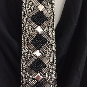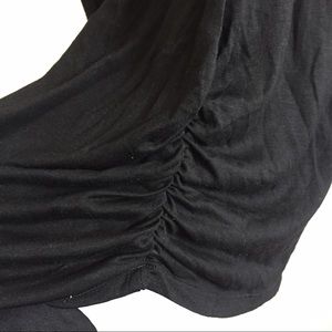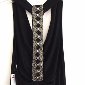 I'm selling a NWT bodycon dress with a T detail decorated with beads on the back and some ruching details on the lower sides for a perfect fit. This dress can be dressed up or down with some flat sandals or gladiator sandals . It has a deep slouchy neck in front. It's tagged as size L but It's a better fit for a 4-6 that's why I'm labeling it as such. 95% rayon 5% spandex. Length from top of shoulder to bottom hem 39".