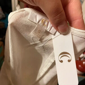 Brand new with tags. Super pretty and dainty white flowy top with twist on front. WOMENS size small. Would be great for a bridal shower!