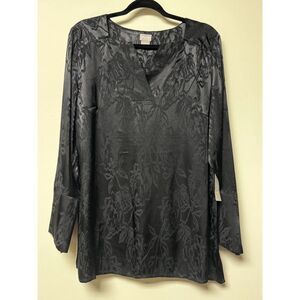 Beautiful satin floral jacquard pattern v-neck long sleeve popover blouse with side vents. Button cuff. Chico's size 2 = US size 12/14.