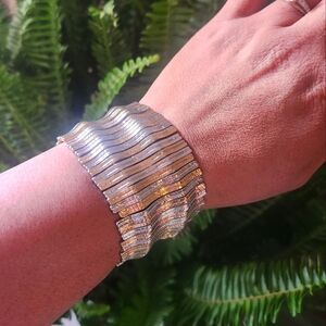 The Silver and Gold Tone Stretch Cuff Bracelet is sublty stylish. This easy-to-wear design features textured silver and gold tone accents that would easily pair with any outfit. Stretches to fit various sized wrists.