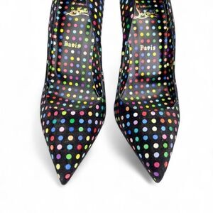 An iconic model, the Hot Chick pump combines elegance with timelessness. Made in black suede, they feature multicolor polka dot prints all over, pointed toe, low cut, scalloped side, slip-on style, high stiletto heels, and the iconic red soles. Perfectly stitched and to ensure an elegant fit.