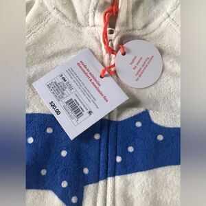 Hoodie Has Cute Polka Dot Blue Whale, Terry Cloth Type Hoodie With Front Zip Two Front Pockets. Hoodie Is An Off White Color.