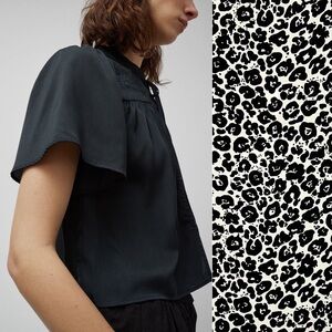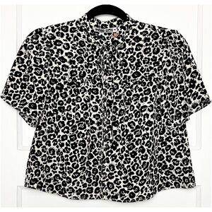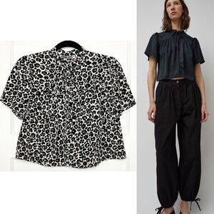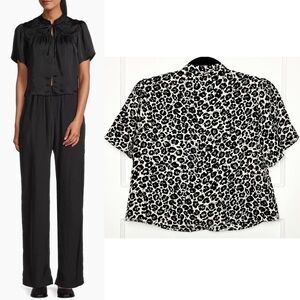 NWT CIAO LUCIA Leopard Short Sleeve Gathered Front Yoke Tie High Neck Crop Top S