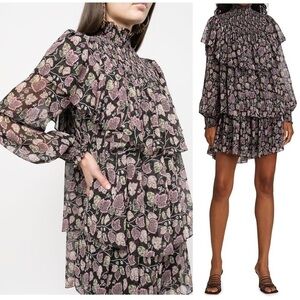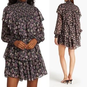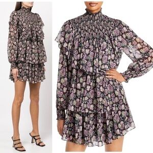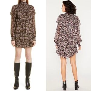 NWT CINQ A SEPT Boho Floral Ruffle Puffed Long Sleeve Smocked High Neck Dress 8