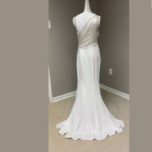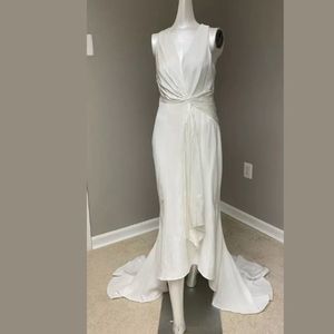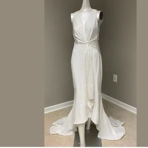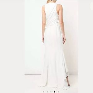 White Iris gown from Cinq á Sept featuring a long length, an asymmetric style, a v-neck and a sleeveless design.