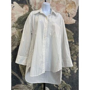 Looks Like: Crisp white with soft brown stripes and a low high hem