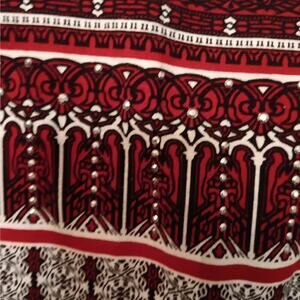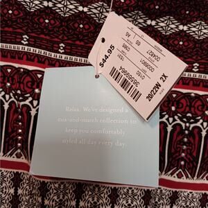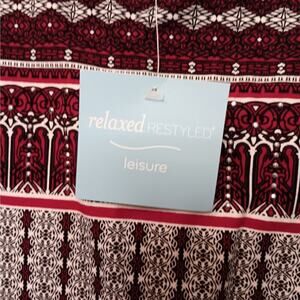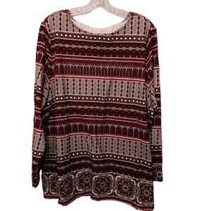 This is a new with tags top with a burgundy, black, and white pattern. It is long sleeved and has a rounded neck. It is made of 95% cotton and 5% spandex. It is front the Relaxed Restyled Leisure line. It measures 25 1/2 from armpit to armpit lying flat and 28 from the nape of the neck to the hem. It has some sequin/rhinestone embellishments across the chest.