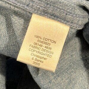 This NWT CJ Banks Y2K women's large embroidered denim shirt in a solid blue color features a classic fit with long sleeves and a collared neckline. This shirt jacket is adorned with embroidered accents of apples in a basket design, perfect for autumn and fall-themed occasions. Made of cotton denim, this vintage-style button-up shirt is machine washable and suitable for travel, parties, or casual wear. Ideal for women who appreciate Americana, country, or festival-inspired looks, this shirt is a stylish and comfortable addition to any wardrobe.