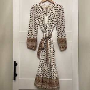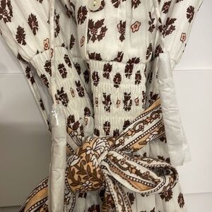 100% Cotton Windsor print, white with a neutral brown, tan print Long puff sleeve Smocked, stretchy waist with removable / adjustable tie NEW, new with tags boho, bohemian, peasant, cottagecore, farmcore, prarie, fall, spring, summer, transition, classy, conservative, modest, easter, holiday, event, day party, shower, church, brunch, meet then parents puff sleeve, revolve, anthropologie