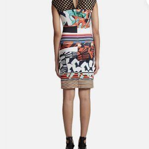Signature Clover Canyon mixed-print dress with perforated mesh neckline and flattering bodycon fit. Artistic geometric + tropical print combo.