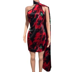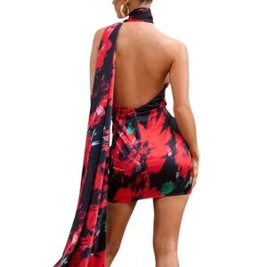 NWT CLUB L LONDON Nasira Black Floral Asymmetric Neck Open Back Mini Dress