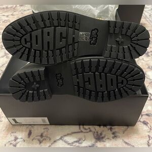 COACH Farrah Leather Boot featuring a breathable fabric and man-made lining with lightly cushioned, stationed insole. Inner zip closure and hardware detail at sides. Round toe and block heel. Rugged synthetic sole. Imported.