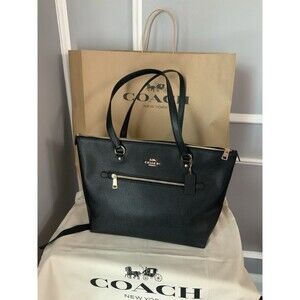 This Coach Gallery Tote Bag is a stylish and functional accessory for any woman. With a zip closure and spacious interior, it's perfect for carrying all your daily essentials. The black leather exterior is accented with gold hardware, giving it a sleek and sophisticated look.