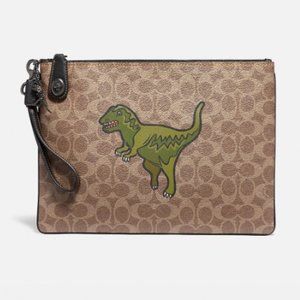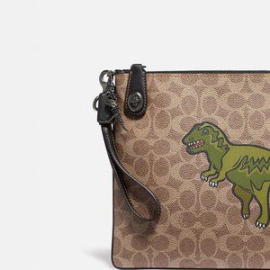 With space for an iPad, this Signature canvas case is perfect for organizing tech and accessories when on the go. Featuring Rexy the Coach mascot dinosaur front and center, it secures with a turnlock closure and is finished with a Rexy charm. Carry it alone or keep smaller items organized in backpacks and bags.