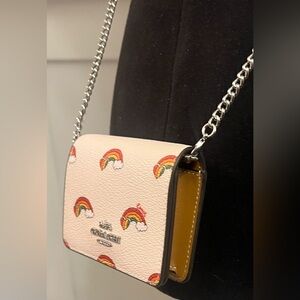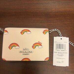 NWT COACH MINI WALLET ON A CHAIN WITH RAINBOW PRINT Printed coated canvas and smooth leather Two credit card slots Snap closure, fabric lining Outside open pocket Detachable chain strap with 23 1/4" drop for shoulder or crossbody wear Approx 4" (L) x 3" (H) x 1" (W)
