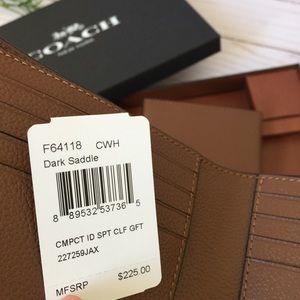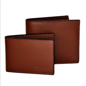 NWT COACH Men Wallet Gift Set F64118 in DARK SADDLE. This nice 3 in 1 Wallet Box from COACH is roomy and spacious. You'll have room for all your essentials and then some while making a real statement. This is a COACH must have or a great gift idea! Style Sport Leather; 1 solid leather Full Size Double Billfold Wallet; 8 Card Sleeves 2 Full Size Bill Pockets; 2 Inside Pockets.