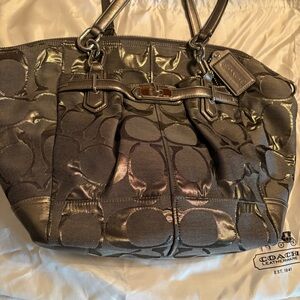NWT COACH Gray Silver Olive Metallic Signature "C” Logo Shoulder/Handbag #17866 with cloth protector bag. This 12" H x 16" W purse is in excellent new with $398 price tag attached. Perfect to keep or give as a gift. Has 2 outside pockets as well as inside pouches and zippered compartment. Zipper closure. Converts from a double handle handbag to shoulder bag with removable strap. Includes the Coach Logo tag. Accents; Buckle Accent, Pleated, Strap Accent, Zipper, Buckle, Logo, Strap. Non-smoking home