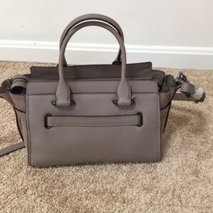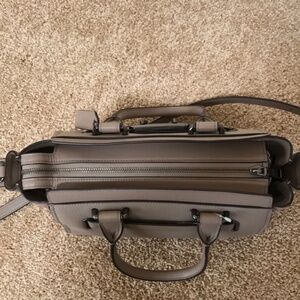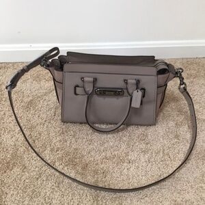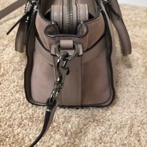 NWT! COACH tan leather with suede on the sides satchel. Has one Zippered pocket and one pocket with snap button inside and one open pocket outside. Comes with long crossbody strap.