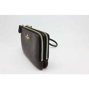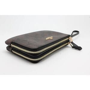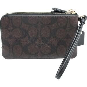 NWT COACH Women Double Corner Zip Wristlet In Signature Canvas Brown Black-OS
