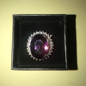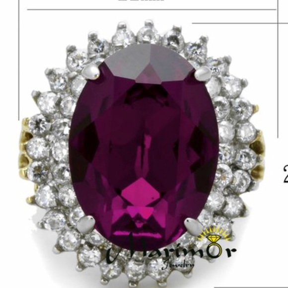 Stainless steel two toned with oval cut purple center stone with a carat weight of 14.5. 53 round clear crystal stones in pave setting. Hypo allergenic and will not tarnish or oxidize over time. Beautiful ring! A real attention getter. Size 8.