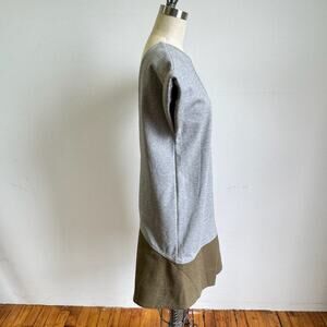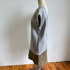 Details: New with Tags from NYC-based multi-disciplinary art platform and fashion label Cocurata, this gray and olive green drop waist dress features textured, geometric zen embroidery stitching throughout. This garment is structured and has two large pleats in the skirt as well as rolled cap sleeves and a low cut open back. Add some art to your closet!