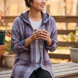 Stylish plaid hooded shirt with button-up front. Features a mix of gray and pink colors.