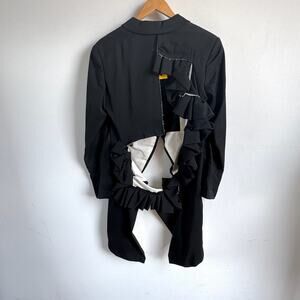 Details: COMME DES GARCONS Couture Cut-out wool Blazer for Selfridges & Co. One of kind of piece has a classic black tuxedo jacket front with 2-button closure and a cut-out, raw edged back with ruffles and coat tails. Fully lined in cotton with one welt breast pocket and buttoned cuffs. Made in Japan from 2018 collection.