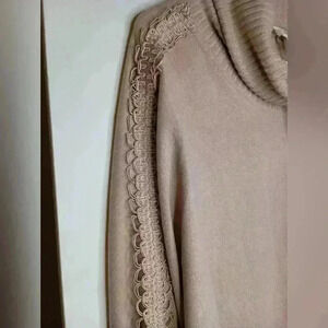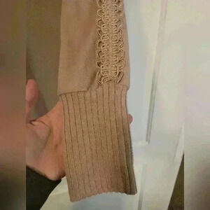 long sleeve cowl top with crochet design on the arms. Color is taupe. This is a VERY SOFT and comfortable top