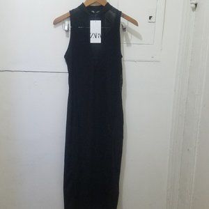 Sleeveless midi dress with high round collar. Tonal matching fabrics.