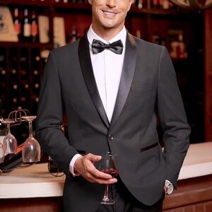 Contrast color lapel, slim fit, two front fake pockets, one button closure, three inner pockets, four button decor on cuffs, classic suit coat Match this formal blazer with your dress shirt and suit pants,plus a bow tie