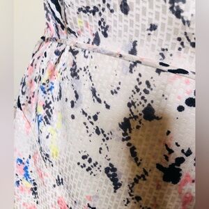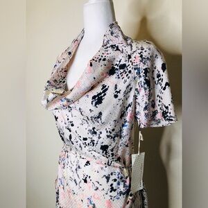 Made from high-quality silk, this dress features a stunning abstract paint splash print. Its cowlneck design adds a touch of allure, making it a must-have for your wardrobe.Pair it with your favorite heels and accessories to complete the look. Ivory/ Size: 2