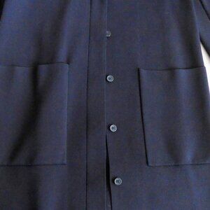 Details: Unlined. Covered button placket with six buttons. Extra button on label. V-neck. Long sleeves. Two large pouch pockets on exterior hips. Two large slits up the sides.
