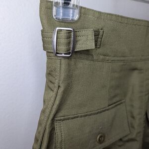 utility style, adjustable tabs at waist, side slant pockets and back button flap pockets