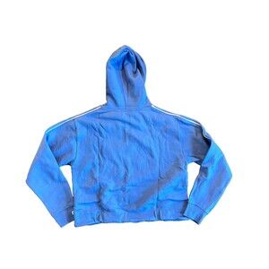 Blue cropped hoodie with white piping stripes down the arms and around the hood. Made of organic cotton and recycled polyester blend. Color is called Lupine. Women's size Large. New with tags.