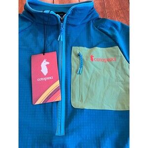 New with tags! Cotopaxi Otero Fleece Half-Zip Pullover jacket in Gulf color way. Teal Blue with Green. Half zip pullover with chest zipper pocket and thumb slot on the sleeves. Has a waffle knit type of texture. Gear for good. Women's size Large.