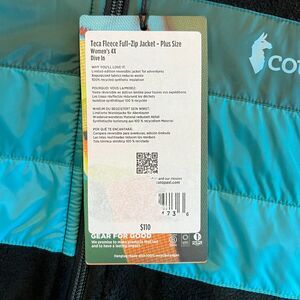 New with tags! Cotopaxi Teca Fleece Full Zip in "Dive In" color way. Made of recycled fleece. Gear for good. Women's plus size 4X.