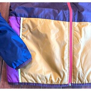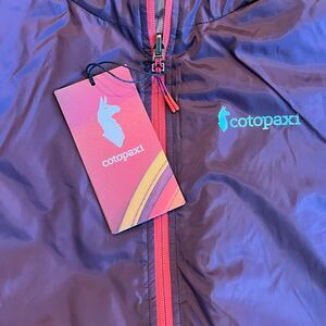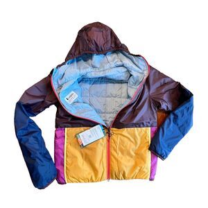 New with tags! Cotopaxi Teca Calido jacket in Countryside color way. Multi-colored color block in purple, pink, gold. Reversible to solid light blue. Full zip with zippered pockets. Gear for good. Women's size Small.