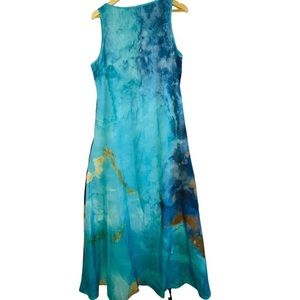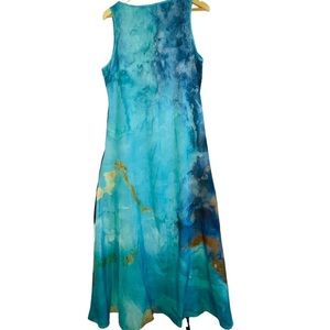 Blue and gold abstract print, sleeveless, oversized pull over maxi dress with two front pockets