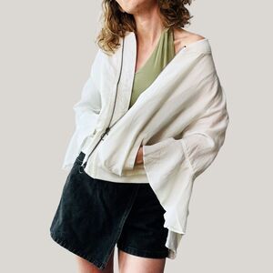 This lightweight jacket features a sleek bomber silhouette with tiered ruffle sleeves, breathable linen-blend fabric, and a rare double zipper for styling versatility. Elegant enough for brunch, cool enough for the street—this jacket does both.