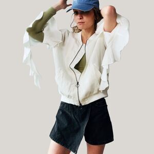The CQ by CQ Ruffle Sleeve Bomber Jacket is where tailored edge meets romantic flow—because your layering game should have main character energy.